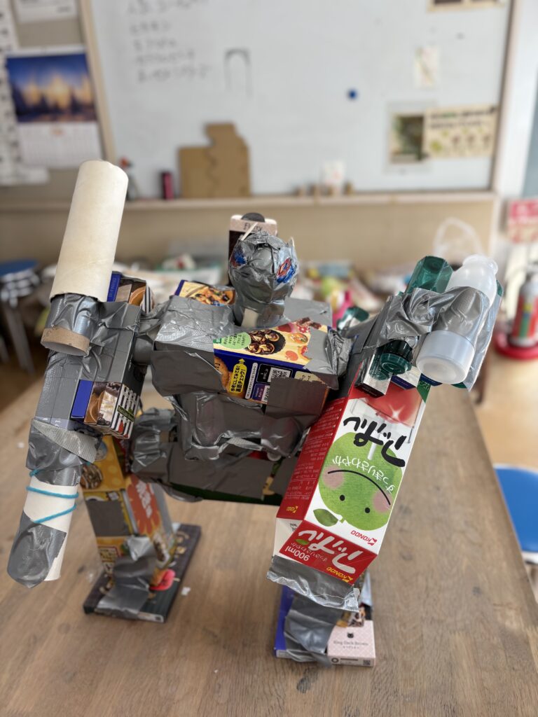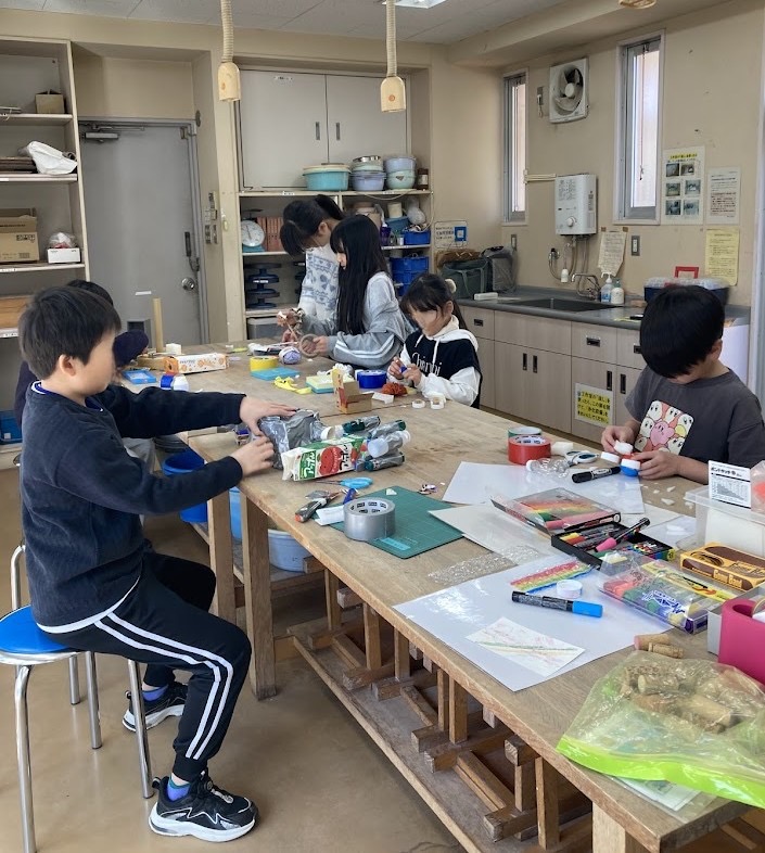 アート工房ごろごろで、久しぶりの自由工作をやりました。いつもなら、「〇〇をつくろう」というブログラムがあるので、どんな感じかなと思って見ていましたが、みんな材料を見て、どんどん作り始めました。作りながら、子どもたちに「今人気のユーチューバーって誰?」と質問したり、学校の話をしたり、わいわいとにぎやかに。でも全員集中して作っている時、とても静かになる時間があり「今は静かな時間だ!」とつぶやく子が。するとまたみんながしゃべりだして、一人の子が「手が動くときは口が動かないけど、口が動いているときは手が止まるんだよ。」なんて話をして一つのテーブル(作業台)でみんなー緒に作る空間がいいなあと感じました。