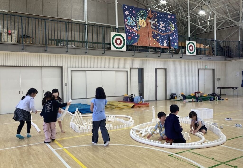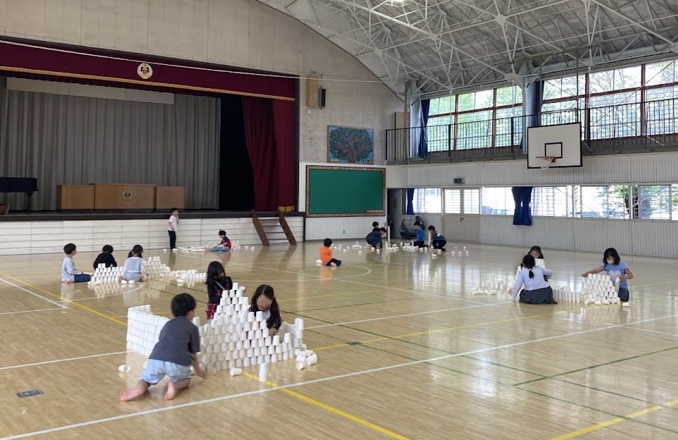1、2年生の保護者会の間、体育館で紙コップタワーをして遊びました。