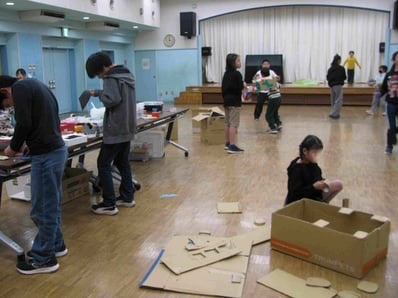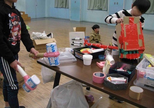 11月末から来始めた兄妹の兄は昨年末に作った武器?を持ってやってきて、新たな武器をつくり、他のメンバーと戦いごっこ。妹はカッターで段ボールをくり抜き、黙々と作業を始める。途中からは2年生が加わり一緒にラーメンの屋台作り。