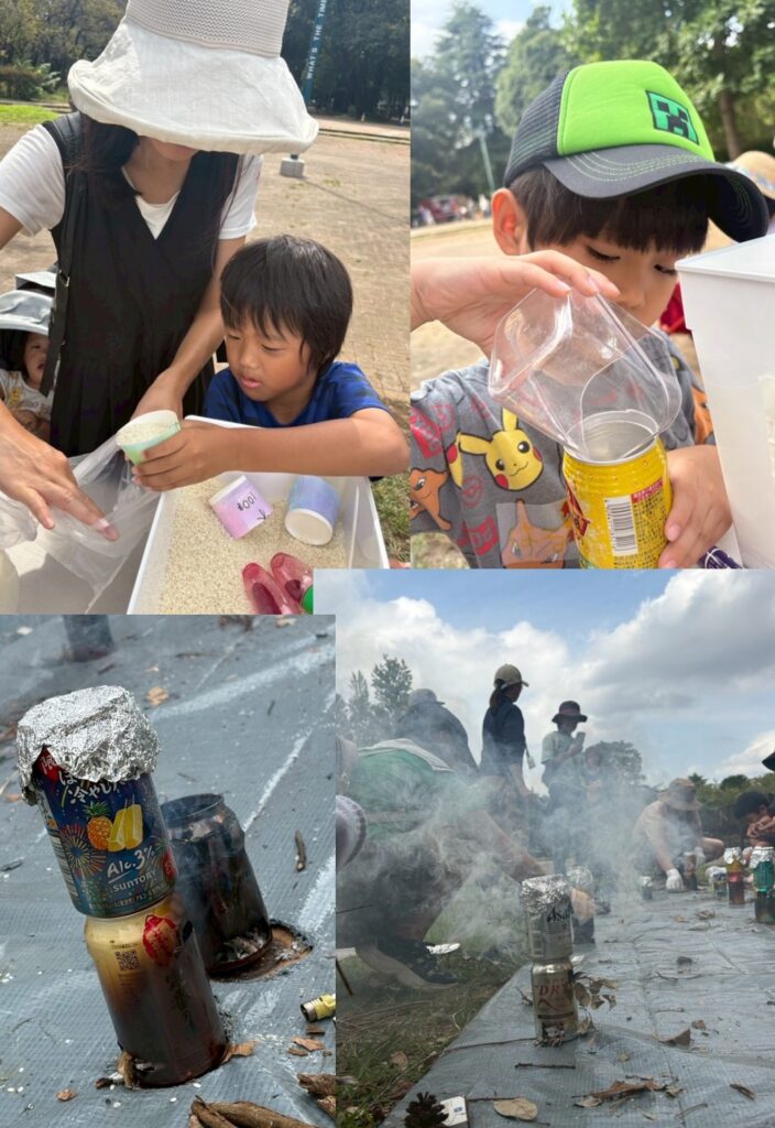 空き缶や耐熱ポリ袋にお米と水を入れ、電気やガスを使わず、身近なもので火を起こしお湯を沸かし、ご飯を炊く体験を行いました。