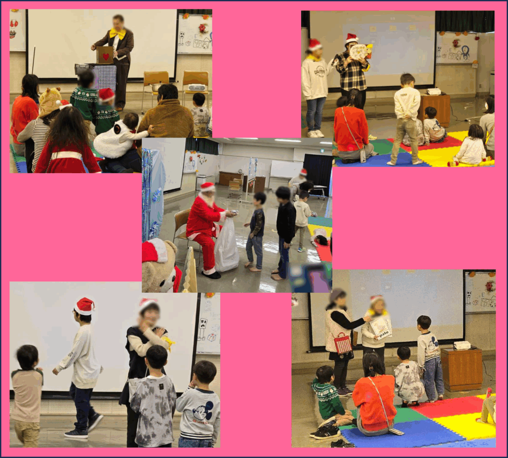 クリスマスバージョンの手遊びや、赤鼻のトナカイダンスで楽しく体を動かした後、サンタクロースがよい子のみんなにプレゼントを持ってきてくれました♪