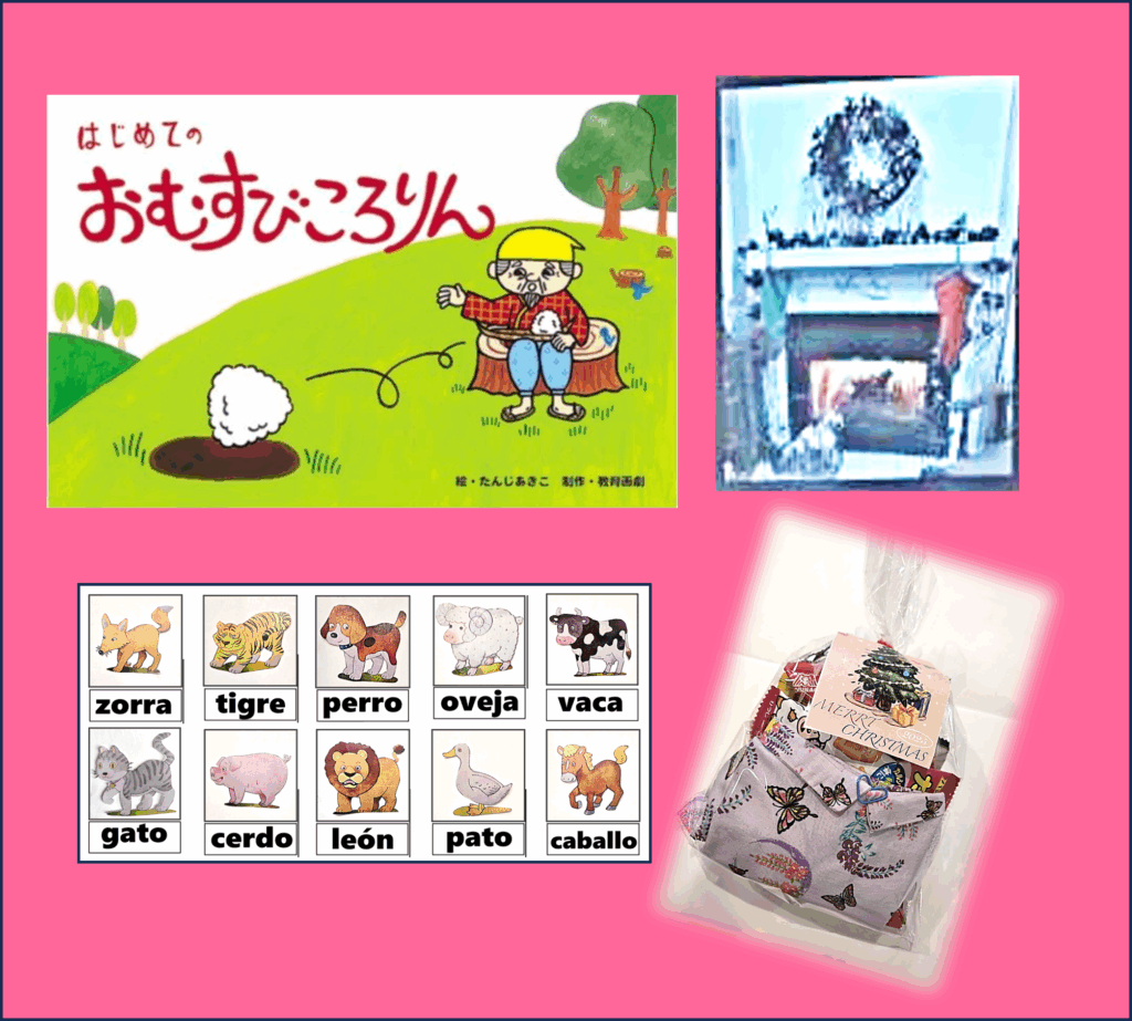 「おむすびころりん」を中国語・韓国語で、単語絵カードをスペイン語でたのしく読みました✨️