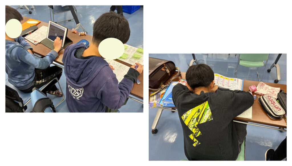 中学部は、学級閉鎖のほかに期末テスト直前というタイミングもあり、やや淋しい状態でした。逆にそのおかげでマンツーマン体制で支援を受けながら各自しっかり学習を進めました。中3生の一部は15分ほど延長して試験対策に取り組みました。